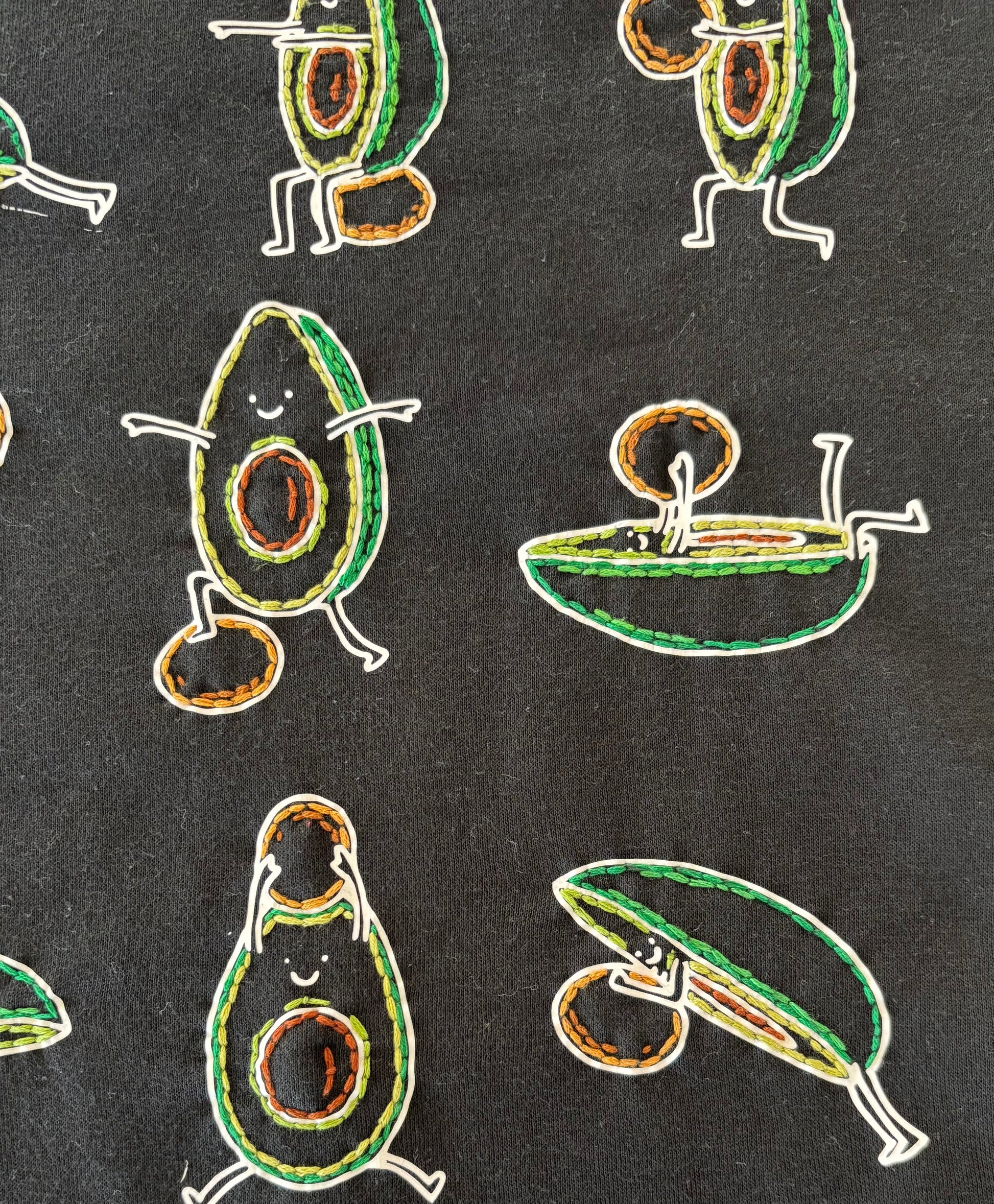 Vinyl iron on images with hand embroidered details. These are one-of-a-kind and no two are the same.
