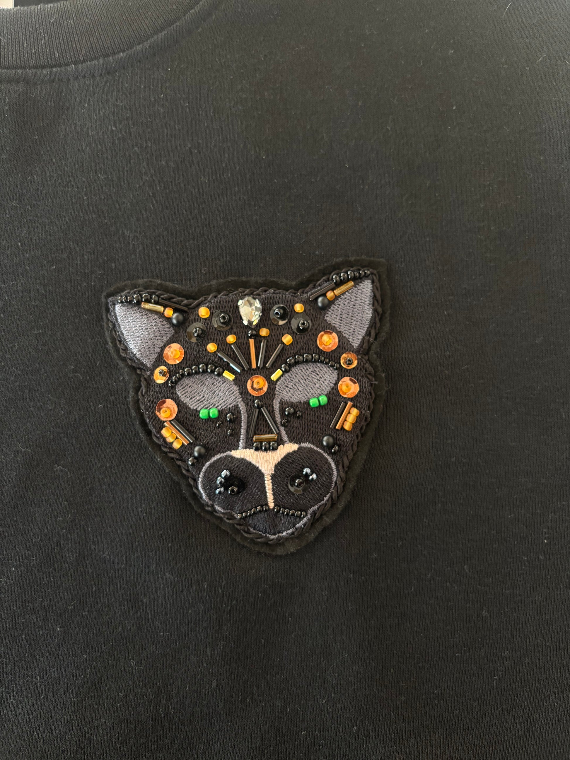 This gorgeous jaguar is embroidered, beaded and finished off with silk cord for the ultimate look of luxury.