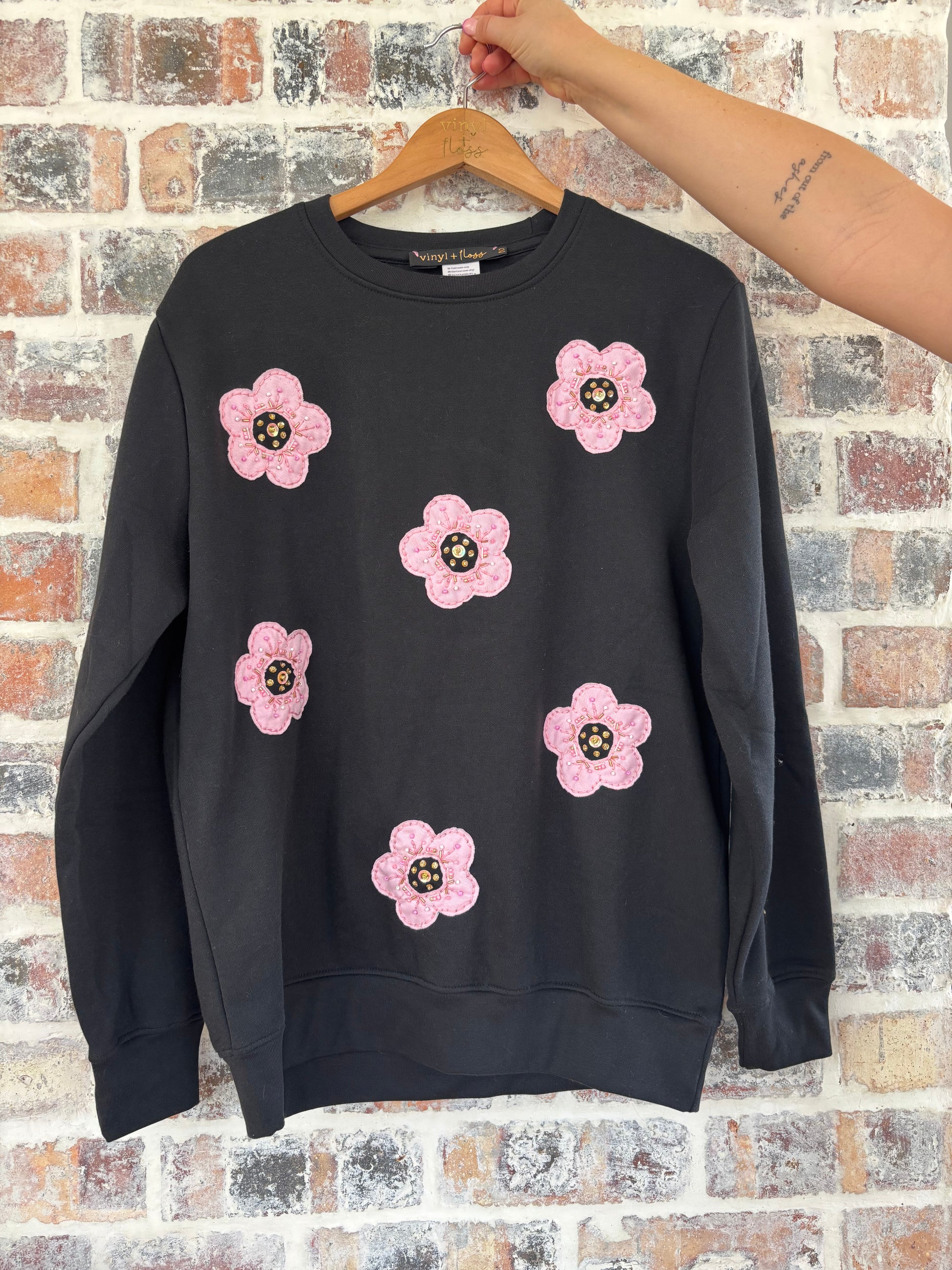 Big pink fabric flowers adorned with embroidery and beads. Elevate your look with this bold top.