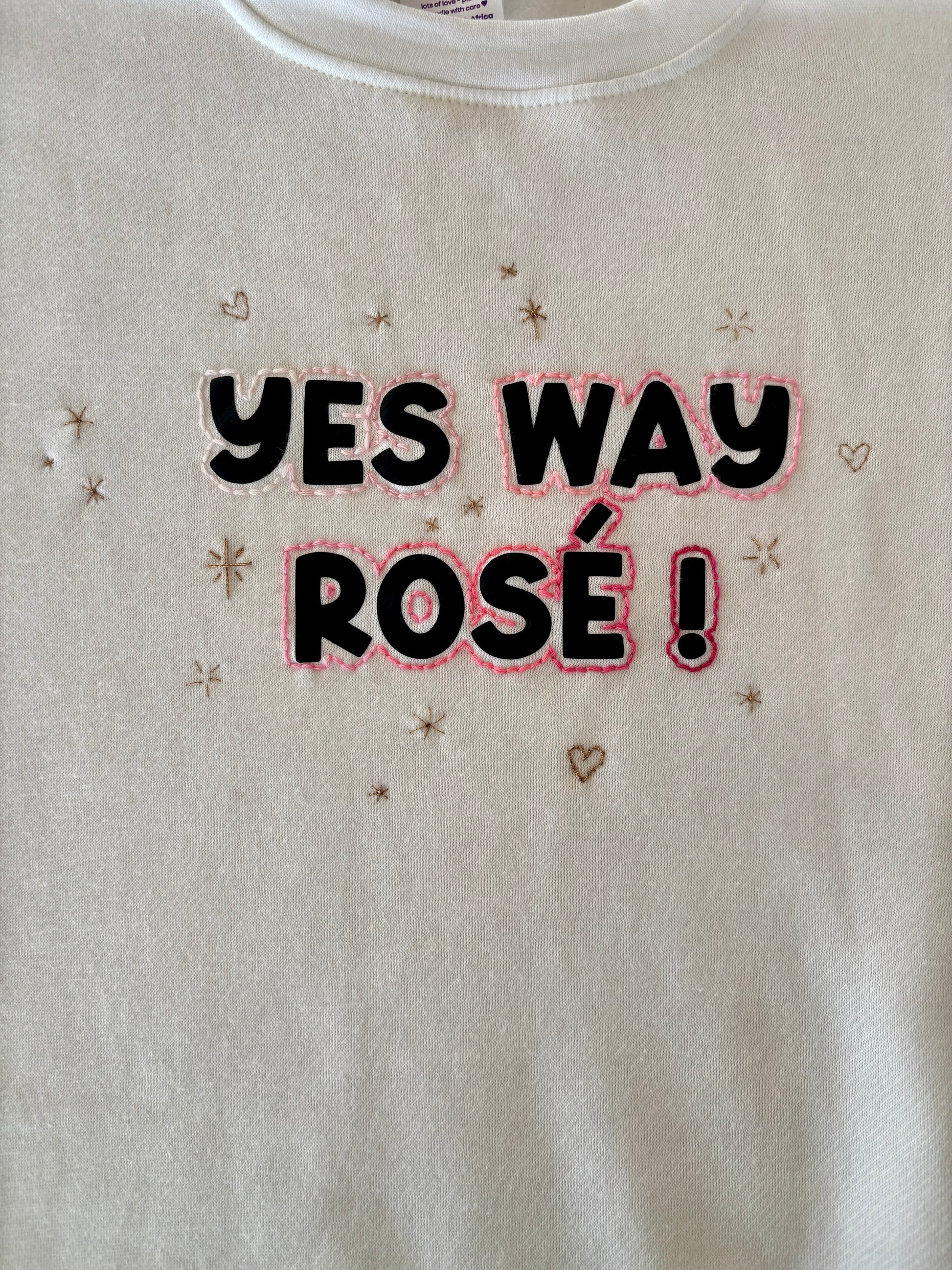 Vinyl iron on lettering with hand embroidered details and rose gold sparkles. These are one-of-a-kind and no two are the same.